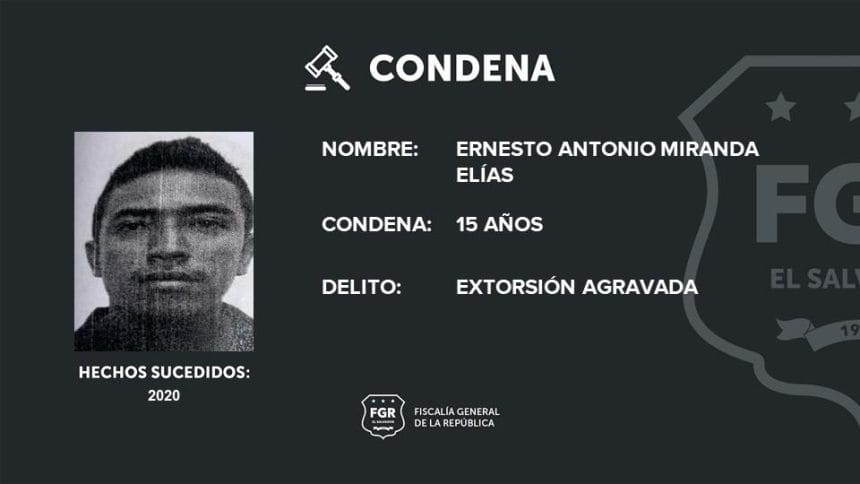 El pandillero Antonio Miranda Elías recibió una condena de 15 años de cárcel por el delito de extorsión agravada, ha informado este lunes la Fiscalía General de la República (FGR)