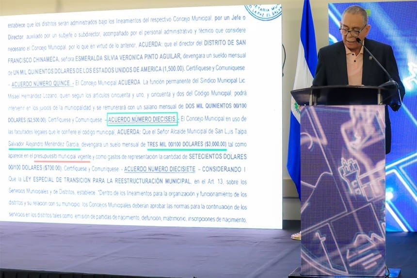 «En el acta claramente se establece que su servidor, como alcalde de La Paz Oeste, tengo asignado el mismo salario de $3 mil dólares que recibí como alcalde de San Luis Talpa, 700 dólares de gastos de representación. Ni un centavo más», detalló.