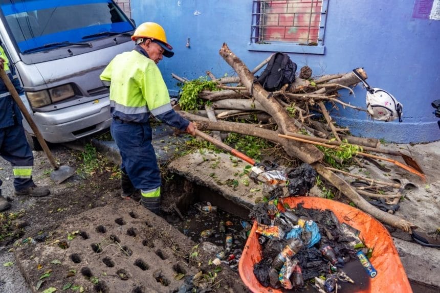 Elementos de la unidad de Desechos Sólidos, intervienen los tragantes obstruidos con residuos, para evitar la acumulación de agua ante las posibles lluvias.