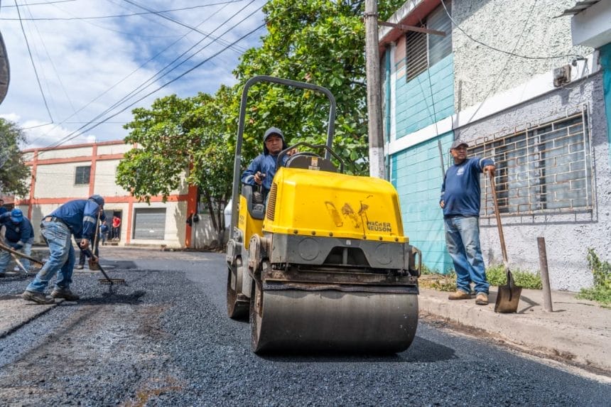La intervención de hoy se desarrolla en el pasaje Ángulo de la colonia Ferrocarril, una zona con elevado tránsito vehicular y peatonal. En el lugar se aplican más de 23 toneladas de material asfáltico para cubrir aproximadamente 285 metros lineales de la arteria, con el propósito de ofrecer calles más seguras y duraderas para beneficio de los transeúntes.