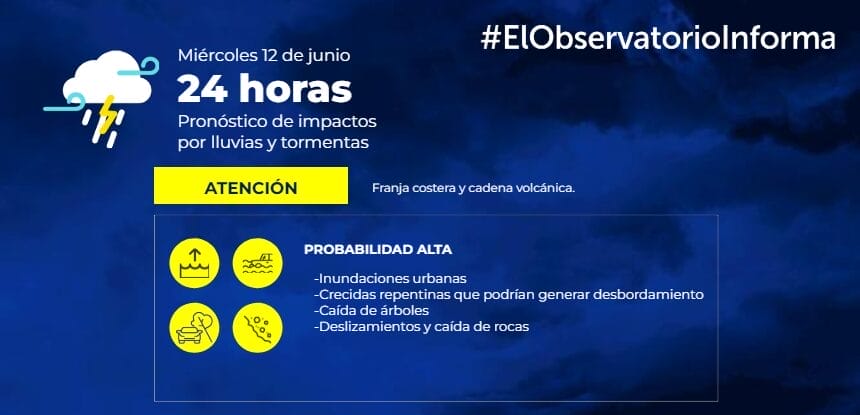 El pronóstico del clima indica alta probabilidad de inundaciones urbanas, caída de árboles, desbordamientos de ríos y quebradas, así como deslizamientos de tierra por las lluvias en las próximas 24 horas.