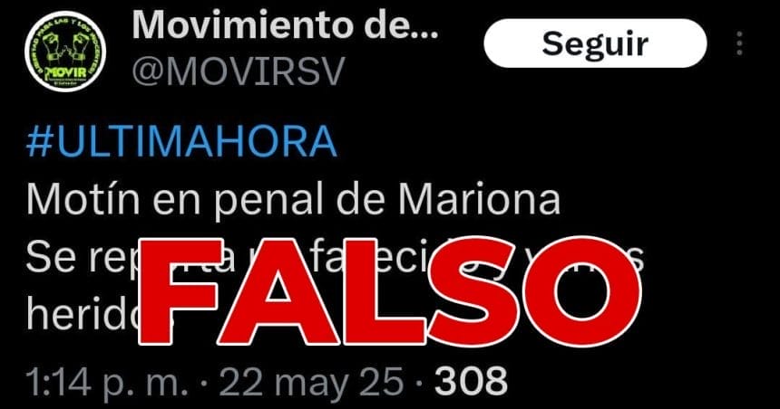Autoridades de seguridad confirmaron este miércoles que es falsa la información que circula en redes sociales sobre un supuesto motín en el centro penal La Esperanza, conocido como Mariona, en el que se habría registrado un fallecido y varios heridos.