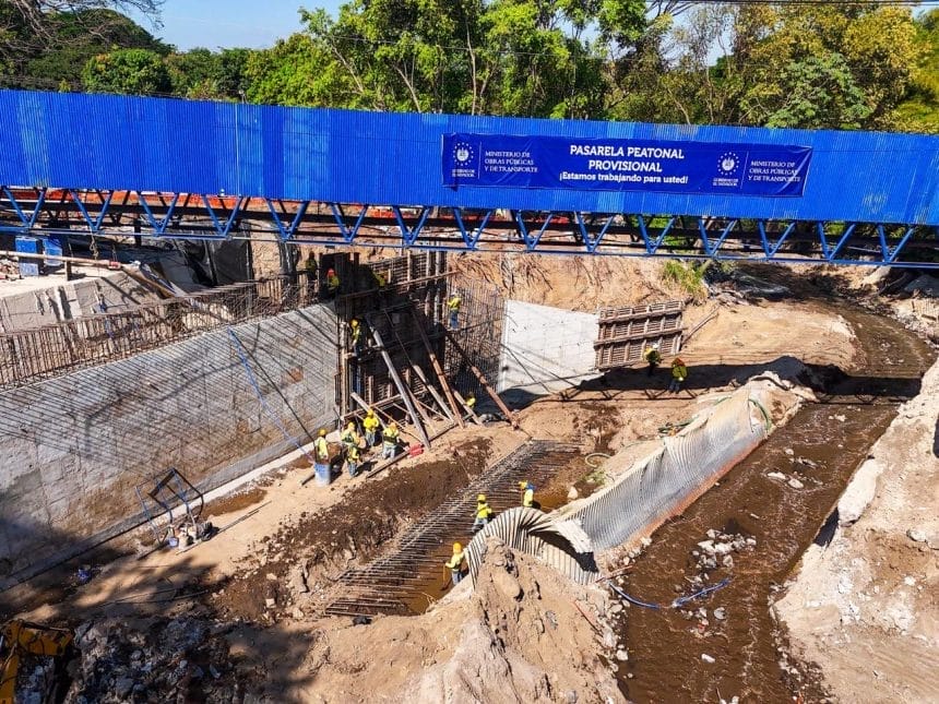 Equipos del Ministerio de Obras Públicas avanzan con la construcción del puente sobre el río Colón, en la urbanización Villa Lourdes, departamento de La Libertad, como parte de las acciones para fortalecer la infraestructura vial y garantizar mayor seguridad a las comunidades de la zona.