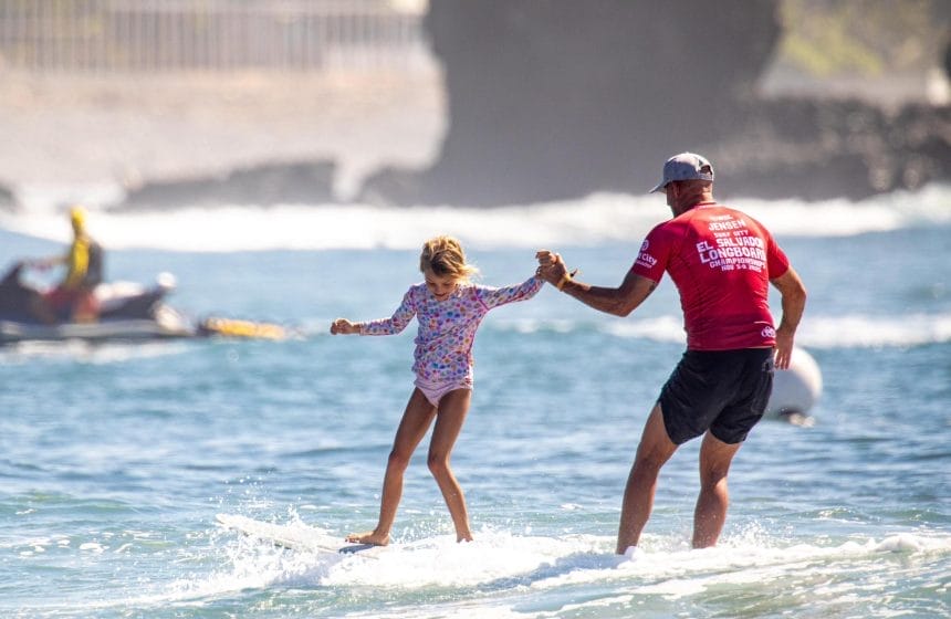 El cuatro veces campeón mundial de longboard de la World Surf League (WSL), Taylor Jensen, fue visto disfrutando de una ronda de práctica en compañía de su hija en la playa El Sunzal, La Libertad, donde se desarrollará el Surf City El Salvador Longboard Championships 2025.