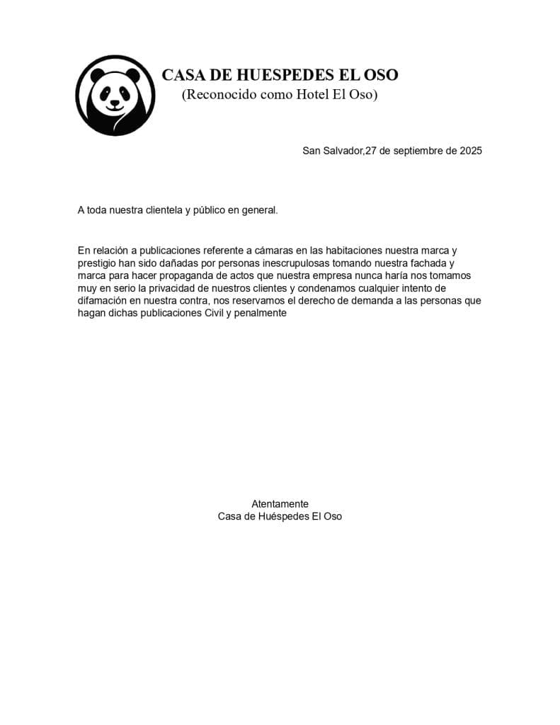La administración de la Casa de Huéspedes El Oso, conocido también como Hotel El Oso, emitió un comunicado oficial para aclarar recientes publicaciones en las que se señalaba la supuesta instalación de cámaras en las habitaciones del establecimiento.