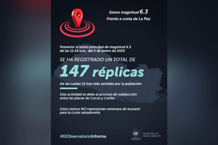 El pasado 5 de enero de 2025, un sismo de magnitud 6.3 se registró frente a la costa de La Paz a las 11:18 a.m., según reportó el Ministerio de Medio Ambiente y Recursos Naturales de El Salvador (MARN).