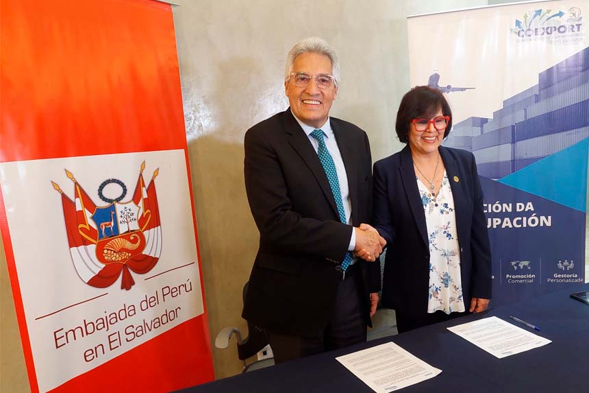 La Corporación de Exportadores de El Salvador (COEXPORT) y la Asociación de Exportadores de Perú (ADEX) firmaron este jueves 27 de febrero un convenio de cooperación bilateral con el objetivo de fortalecer el comercio entre ambos países y fomentar nuevas oportunidades para el sector exportador.