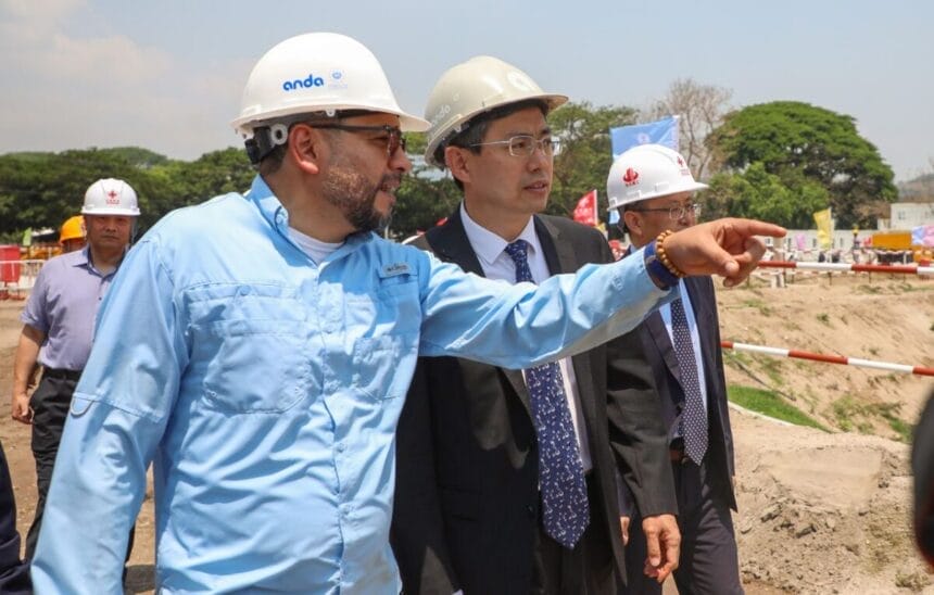 El embajador de China en El Salvador, Zhang Yanhui junto al presidente de ANDA, Rubén Alemán y el alcalde electo por San Salvador Este, José Chicas verificaron este día los avances del proyecto de la planta potabilizadora en llopango.