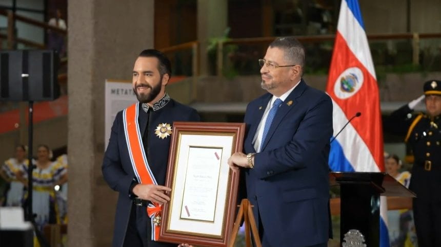 El Presidente de El Salvador, Nayib Bukele, recibió la Condecoración de la Orden Nacional Juan Mora Fernández, por parte de su homólogo costarricense, Rodrigo Chaves.
