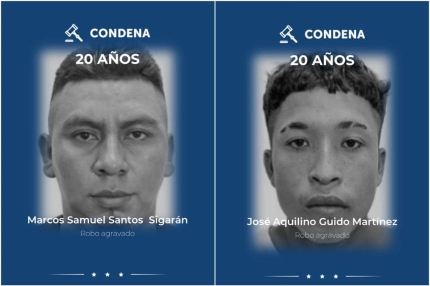 La Fiscalía General de la República informó que Marcos Samuel Santos Sigarán y José Aquilino Guido Martínez fueron condenados a 20 años de prisión tras ser encontrados culpables del delito de robo agravado, cometido en el distrito de Berlín, departamento de Usulután.