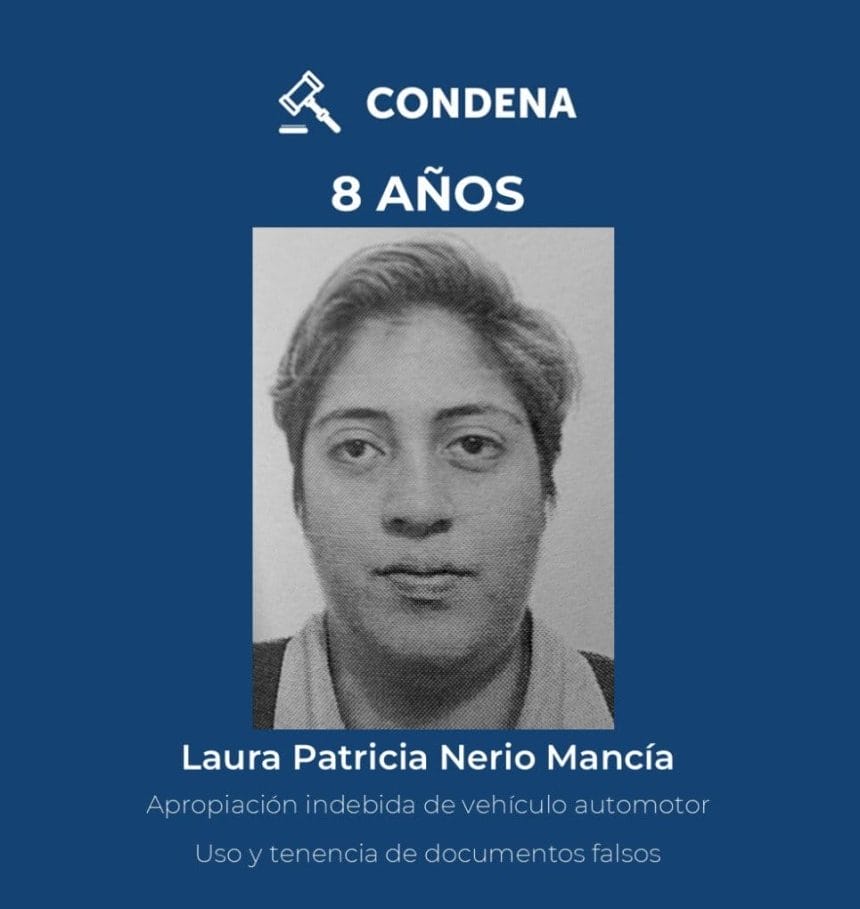 Este día, el Tribunal Tercero de Sentencia de San Salvador condenó a Laura Patricia Nerio a ocho años de prisión por apropiación indebida de vehículo y uso de documentación falsa para su comercialización.