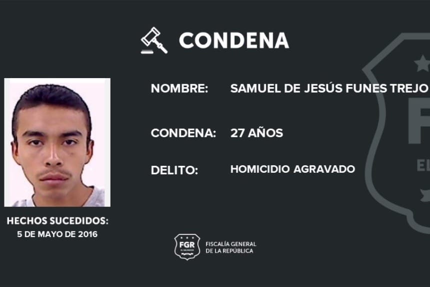 La Fiscalía General de la República (FGR), informó que, Samuel de Jesús Funes fue condenado a 27 años de cárcel por asesinar a una persona en Sesori, San Miguel.