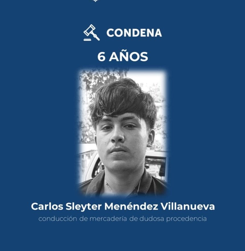 la Fiscalía General de la República informó que Carlos Sleyter Menéndez fue condenado a seis años de prisión por transportar mercadería de procedencia ilegal, valorada en más de $176 mil.