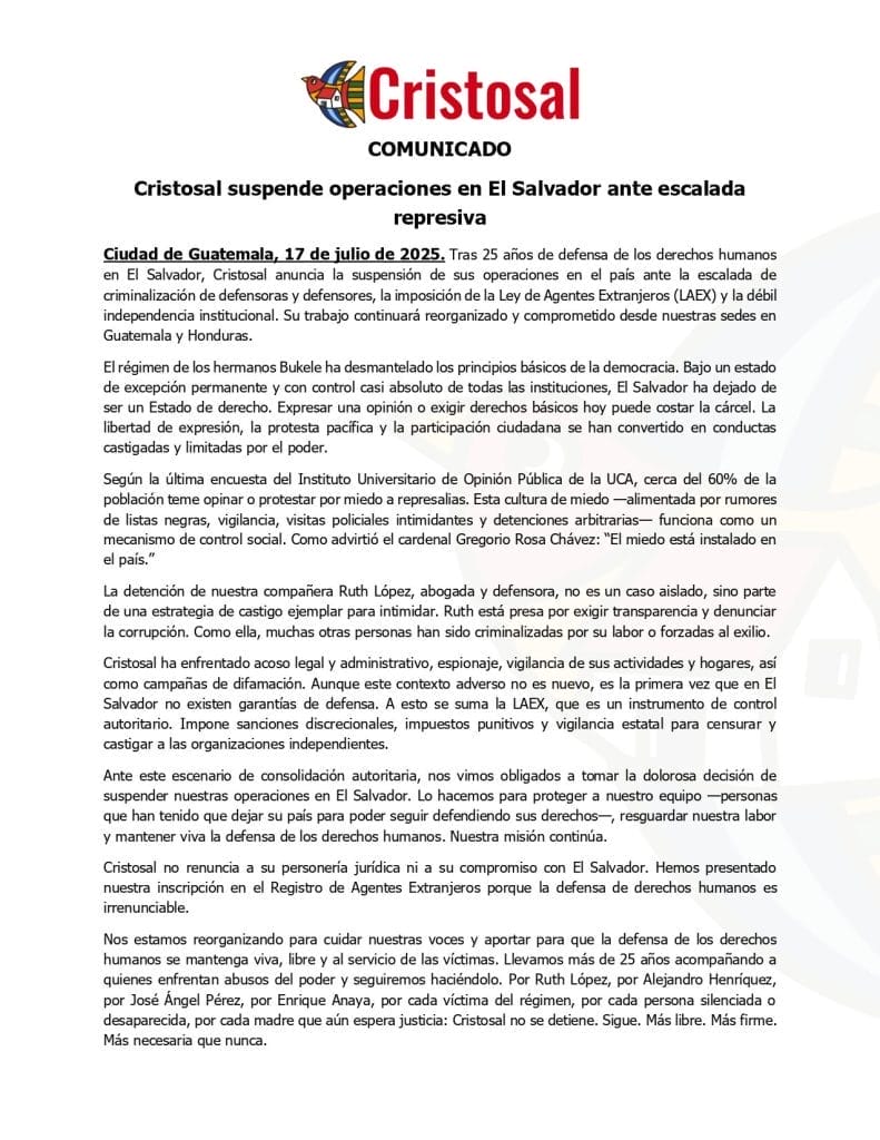 La organización informó que su trabajo continuará de manera reorganizada y comprometida desde sus oficinas en Guatemala y Honduras. Cristosal destacó que ha enfrentado procesos legales, inspecciones y otras medidas administrativas en El Salvador, y que por primera vez en su trayectoria considera que no existen condiciones adecuadas para su operación en el país.