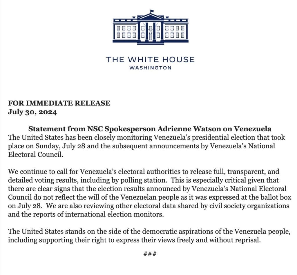 John Kirby, portavoz del Consejo de Seguridad Nacional dijo que, «Es absolutamente fundamental que cada voto se cuente de manera justa y transparente, que los funcionarios electorales compartan inmediatamente la información con la oposición, que los observadores independientes publiquen sin demora el recuento completo y detallado de los votos. Vamos a esperar hasta ese momento. Nosotros y la comunidad internacional estamos observando, y responderemos en consecuencia», advirtió.