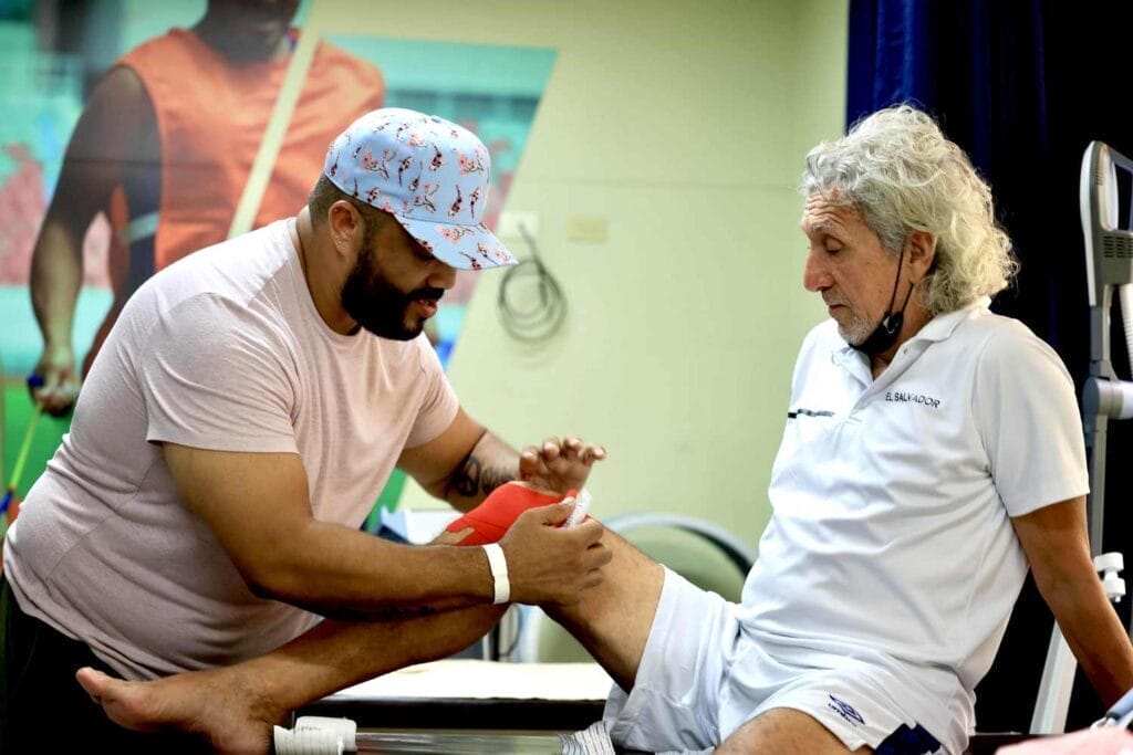 El exfutbolista Jorge “El Mágico” González recibió asistencia en la Clínica de Atención Integral para el Atleta de Alto Rendimiento del INDES por una pequeña molestia en su rodilla derecha.