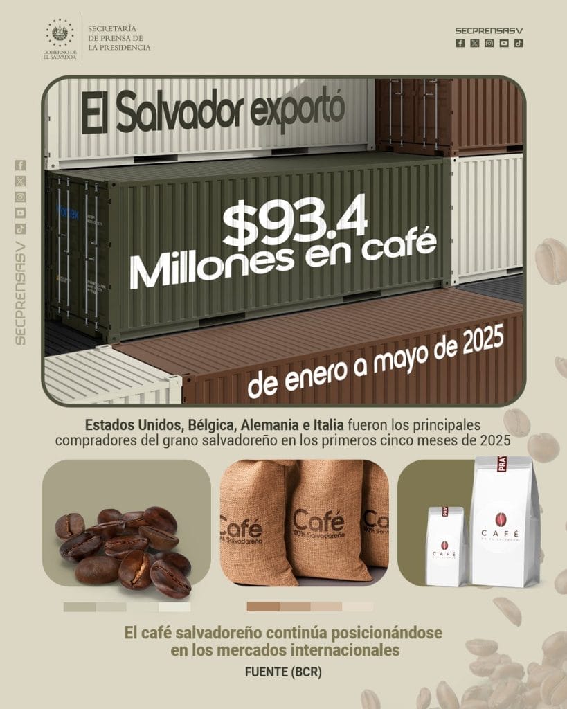El café salvadoreño continúa ganando terreno en los mercados internacionales. De enero a mayo de 2025, El Salvador exportó un total de $93.4 millones en este producto, consolidándose como uno de los rubros más relevantes del comercio exterior del país.