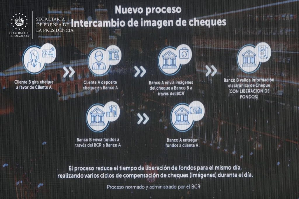 El Gobierno del Presidente Nayib Bukele realiza el lanzamiento de la modernización de cheques “Tu cheque hoy, tu dinero ahora”, a través del Banco Central de Reserva (BCR), donde su titular, Douglas Rodríguez, destacó que esta medida busca cambiar la forma de los sistemas de pago de cara a la innovación de los procesos.