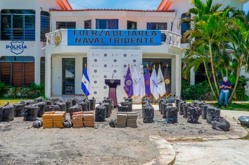 Durante la conferencia de prensa de presentación del más reciente operativo de la Marina Nacional donde fue interceptada, a 920 millas náuticas, una embarcación tripulada por tres ecuatorianos, quienes transportaban 1.3 toneladas de cocaína, valoradas en 32.5 millones de dólares, el Ministro de la Defensa Nacional, René Francis Merino Monroy, destacó que, desde el inicio de la gestión del Presidente Nayib Bukele en 2019, El Salvador ha logrado incautar más de 60 toneladas de diferentes tipos de droga.