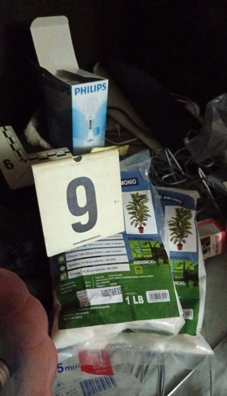 - Evidencia 9: bolsas de sulfato de amonio para cargar los cilindros, este químico que se usa para la agricultura en manos de un explosivista puede ser altamente mortal.
