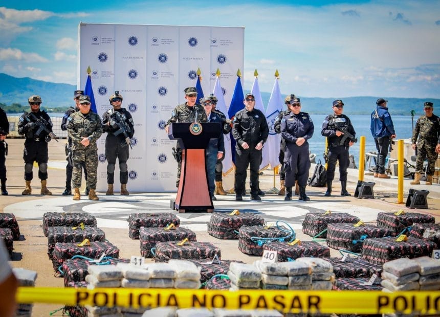El Ministro de la Defensa Nacional, René Francis Merino Monroy, junto al Ministro de Seguridad, Gustavo Villatoro, y el Fiscal General de la República, presentaron en la Base Naval de La Unión los resultados de una importante operación antidrogas realizada en aguas internacionales.