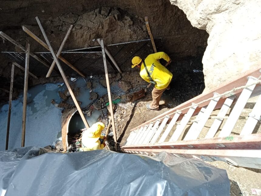 El personal de la institución ejecuta labores de nivelación hidráulica y retiro de material, acciones que permitirán mitigar riesgos y prevenir nuevos daños ocasionados por el hundimiento registrado en la zona.