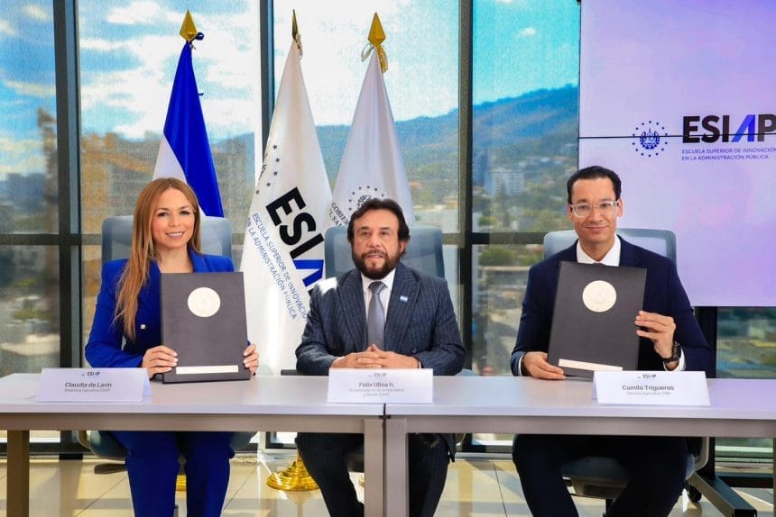 El Vicepresidente de la República, Félix Ulloa, en su calidad de rector de la Escuela Superior de Innovación en la Administración Pública, firmó un acuerdo de cooperación con el director ejecutivo del Centro Nacional de Registro (CNR), Camilo Trigueros, con el objetivo de fortalecer las capacidades institucionales y contribuir a la modernización del Estado salvadoreño.