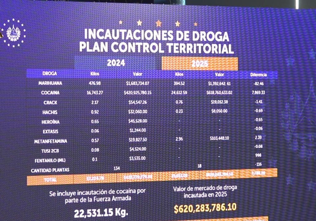 El Gabinete de Seguridad presentó los resultados del combate al narcotráfico durante 2025, destacando la incautación de 25 toneladas de diferentes tipos de droga, la cifra más alta registrada en la historia de El Salvador, según datos oficiales brindados en conferencia de prensa.