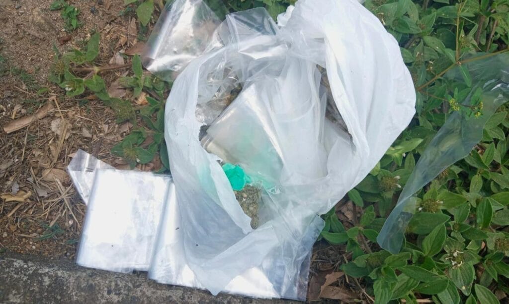 En la bolsa que lanzaron por la carretera fueron encontrados 60 porciones de droga, entre marihuana, cocaína y metanfetamina, además de una balanza digital.
