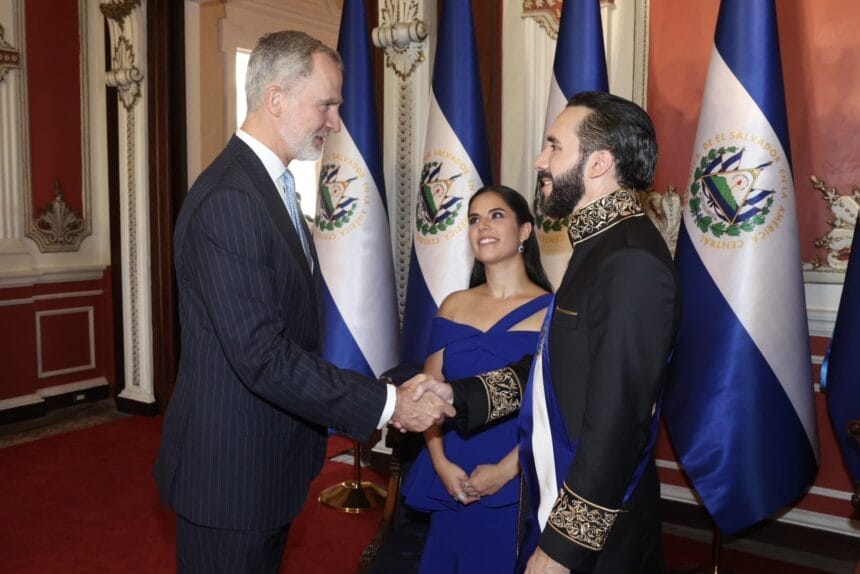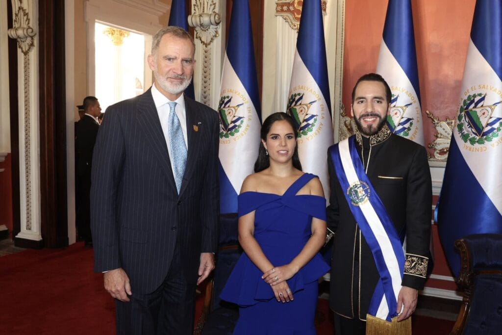 La mañana de este sábado 1 de junio, Don Felipe, asistió al Palacio Nacional donde tuvo lugar la ceremonia de investidura del Presidente Bukele, y que tras su finalización Su Majestad el Rey estrechó la mano del Jefe de Estado salvadoreño y saludo a la primera dama Gabriela de Bukele.