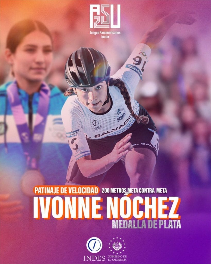 La salvadoreña Ivonne Nóchez, integrante del Programa Esfuerzo y Gloria del INDES, se destacó en los Juegos Panamericanos Junior Asunción 2025 al obtener la medalla de plata en los 200 metros meta contra meta femenino de patinaje de velocidad, con un tiempo de 18.936 segundos.