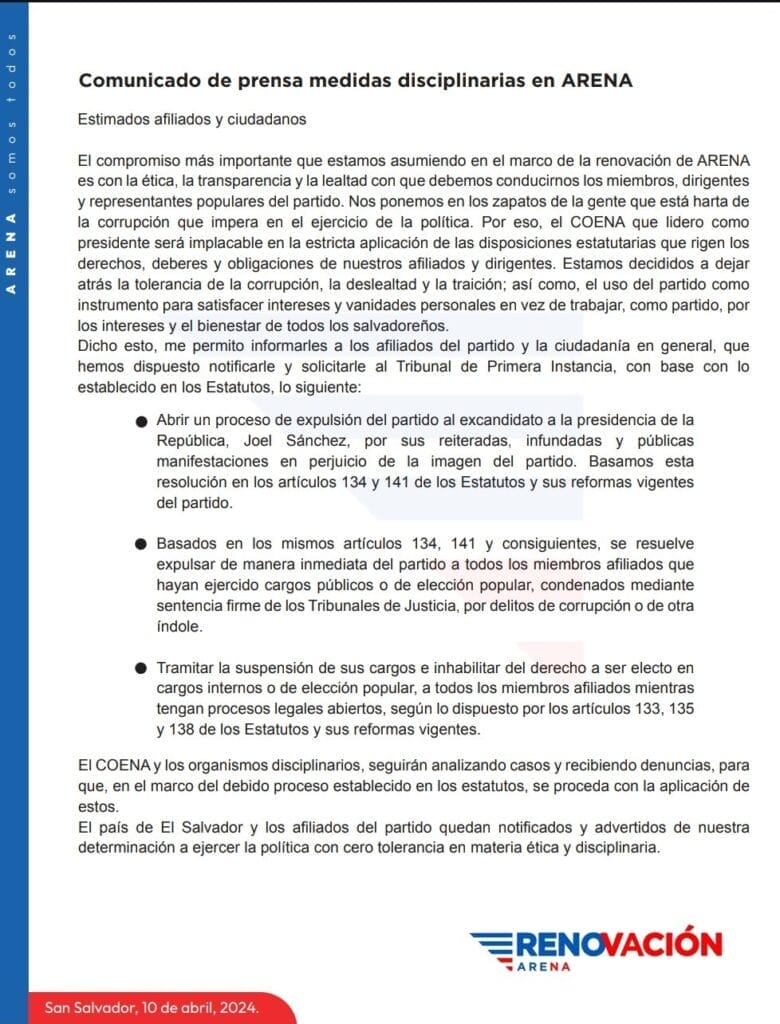 ARENA anuncia el inicio de un proceso de expulsión contra su excandidato presidencial, Joel Sánchez, por supuestas expresiones que afectan la imagen del partido.