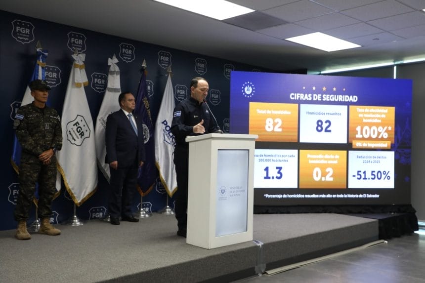 La tasa de homicidios se sitúa en 1.3 por cada 100 mil habitantes, mientras que la reducción del delito alcanza el –51.5% en comparación con años anteriores. Las autoridades destacaron que estos resultados forman parte de una reducción histórica de homicidios a nivel nacional, marcando los índices más bajos registrados en El Salvador.