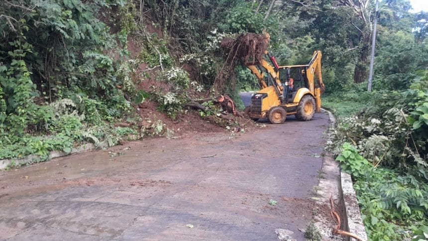 📍 Desalojo de derrumbe en la calle que conduce desde la carretera Panamericana, en el desvío San Benito, hacia Berlín, Usulután, para mantener la conectividad