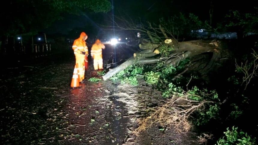 Además, otro equipo del Fondo de Conservación Vial de El Salvador (FOVIAL), brindó asistencia ante una emergencia reportada en la que un árbol caído de mediana magnitud cayó debido a los vientos sobre la carretera entre el desvío de Atiquizaya y el baipás de Ahuachapán.