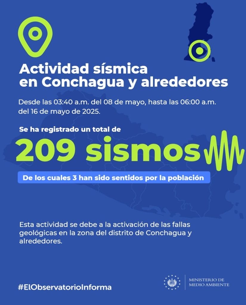 El Observatorio del Ministerio de Medio Ambiente y Recursos Naturales (MARN) reportó un total de 209 sismos ocurridos en el distrito de Conchagua y sus alrededores entre las 3:40 a. m. del 8 de mayo y las 6:00 a. m. del 16 de mayo de 2025.