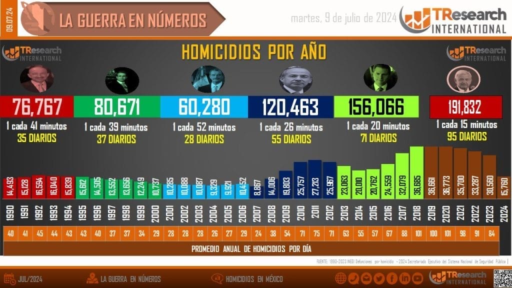 Esto lo respalda la última publicación de la plataforma global investigativa TResearch, quien detalló que, para este lunes, 8 de julio de 2024, el país azteca sumaba 191,832 homicidios en el sexenio de AMLO, con 80 hechos violentos para el lunes 8; 81 para domingo 7; 71 para sábado 6 y 63 en el viernes 5, esto como una referencia a asesinatos diarios en toda la nación.