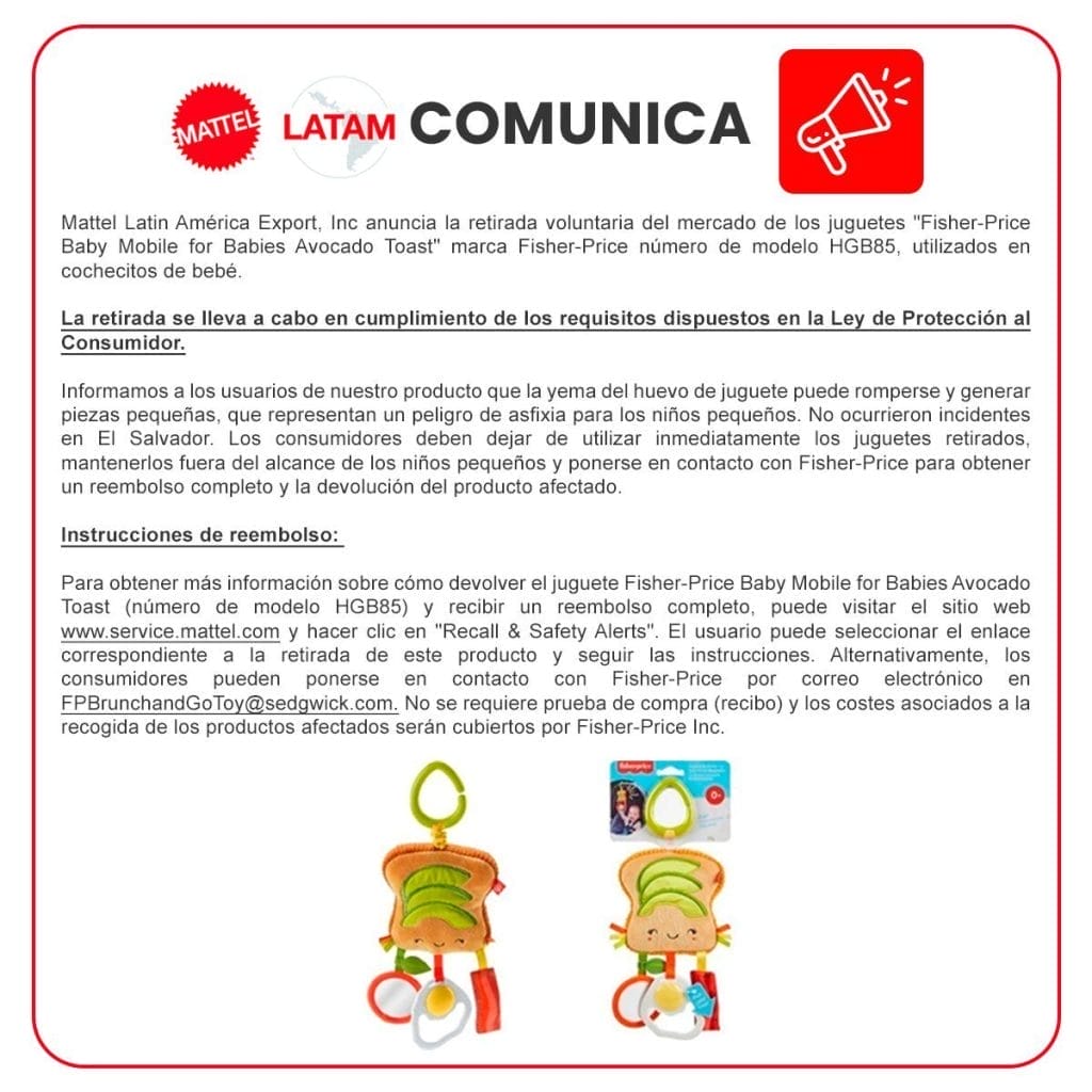 Mattel Latin America Export, Inc. ha anunciado el retiro voluntario del mercado del juguete «Fisher-Price Baby Mobile for Babies Avocado Toast», modelo HGB85, por riesgo de asfixia. Esta decisión se toma en cumplimiento con lo dispuesto en la Ley de Protección al Consumidor de EEUU.