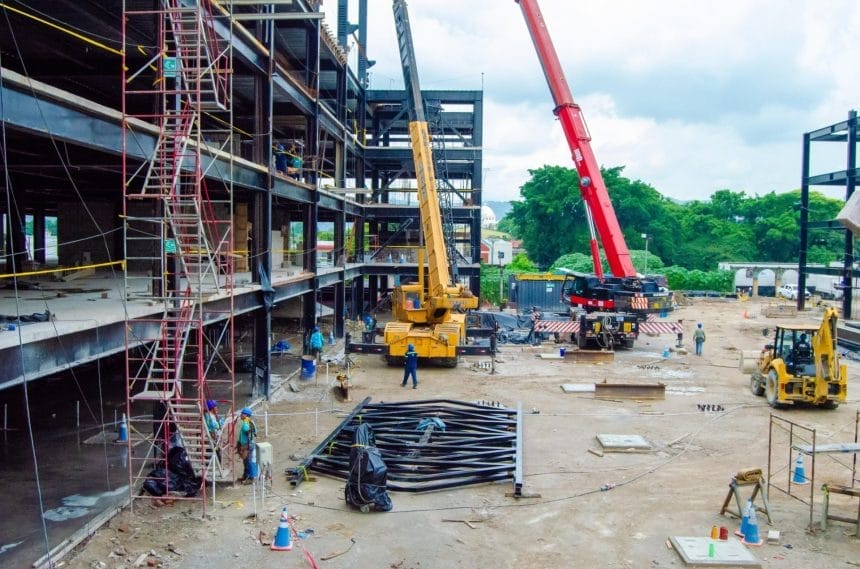 Además, otros equipos llevan a cabo trabajos de terracería alrededor del edificio, y la construcción de una cisterna que será parte esencial del sistema contra incendios. Asimismo, continúan las labores de moldeado de paredes y construcción de tapaderas.