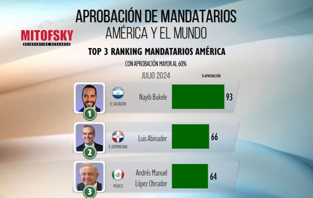 Nayib Bukele de El Salvador: Encabeza el ranking con un impresionante 93% de aprobación, consolidándose como el líder más popular tanto en América como a nivel mundial. Esto se debe principalmente a sus políticas públicas en materia de seguridad que han posicionado al país como el más seguro del hemisferio occidental.