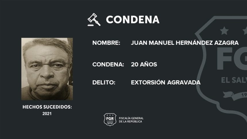 Juan Manuel Hernández Azagra recibió una condena de 20 años de cárcel por extorsionar a un empresario de camiones en San juan Opico, La Libertad Centro, informó la Fiscalía General de la República (FGR).