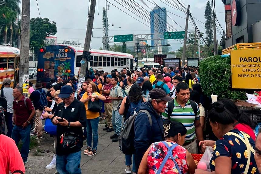 Las paradas de buses ubicadas en la Plaza Divino Salvador del Mundo, en San Salvador, permanecen abarrotadas este lunes debido a la suspensión del servicio por parte de varias rutas del transporte colectivo.