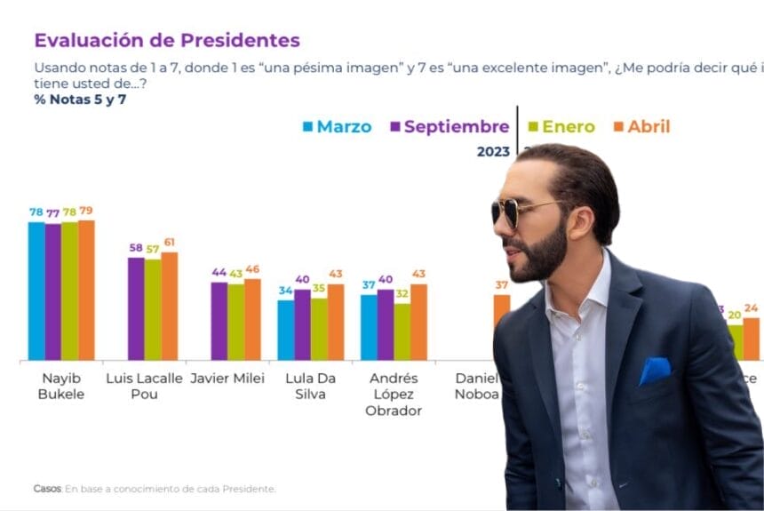 Según una casa encuestadora chilena, el Presidente Nayib Bukele, es el líder latinoamericano mejor evaluado con el 79 %, seguido de Luis La calle Pou y Javier Milei.