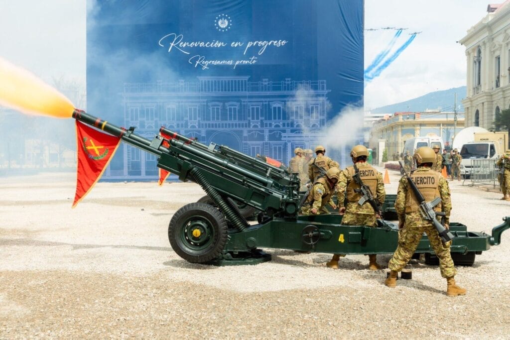 Posteriormente, la Fuerza Armada de El Salvador, realizó el disparo de 21 salvas como homenaje a la #InvestiduraPresidencial del Presidente.