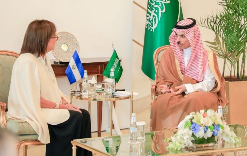La diplomática salvadoreña fue recibida por el príncipe Faisal Bin Farhan, a quien agradeció su apoyo a El Salvador con la suscripción del memorándum de entendimiento para concretar el proyecto de generación eléctrica con biogás y saneamiento de aguas residuales en el río Acelhuate.