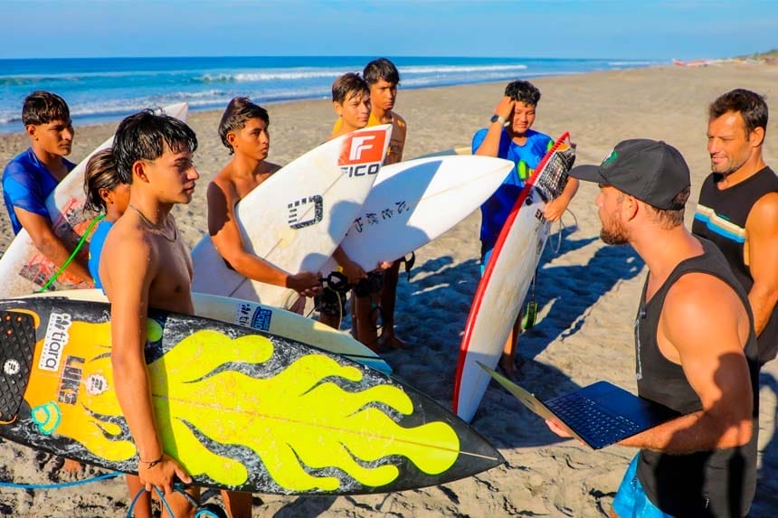 «La idea es generar un intercambio de conocimiento integral, todo lo que tiene que ver con la parte técnica, táctica, física y poder ayudar a los chicos, también, a entender los beneficios y las virtudes que tienen vivir en El Salvador», explica el entrenador de surf, Martín Passeri.