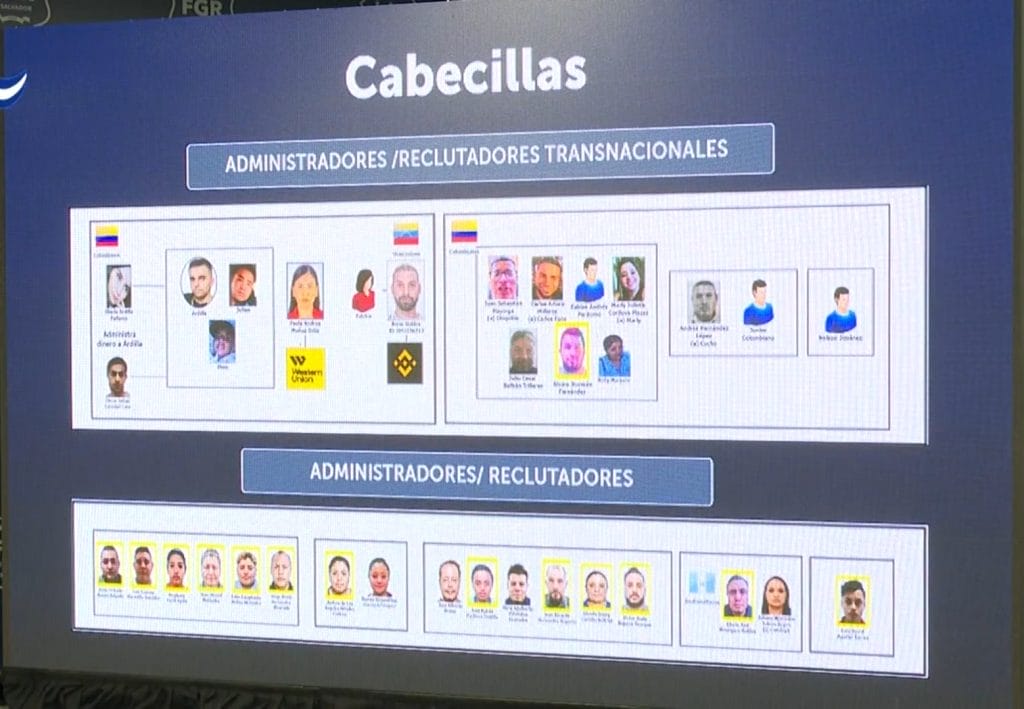 De acuerdo con las autoridades, la estructura criminal estaba conformada por al menos 549 integrantes provenientes de Colombia, Ecuador, Venezuela, Guatemala, Honduras y otros países, quienes operaban mediante diferentes modalidades como falsas ofertas laborales, ventas de artículos, préstamos, inversiones y el esquema denominado “maletas”.