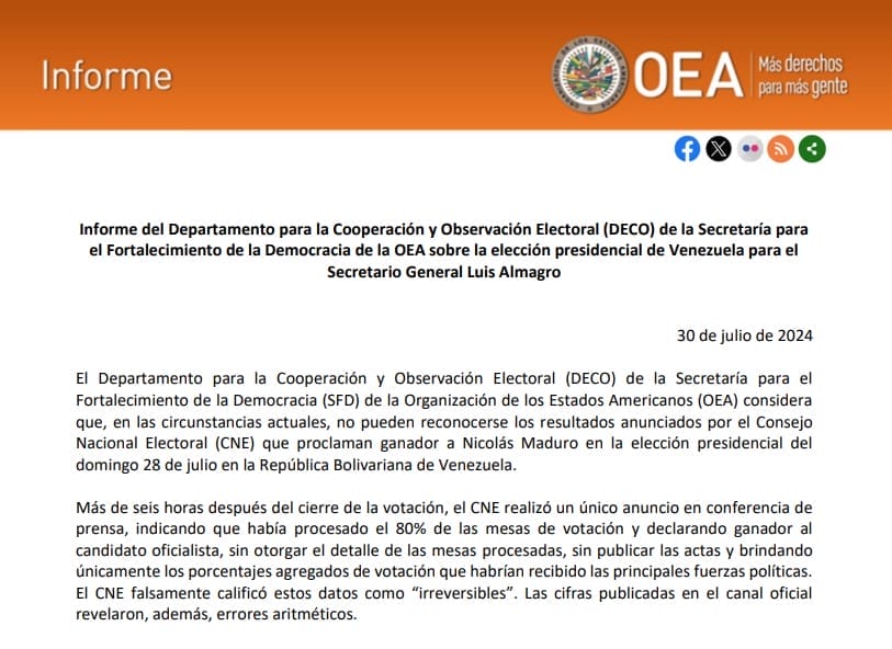 «A lo largo de todo este proceso electoral se vio la aplicación por parte del régimen venezolano de su esquema represivo complementado por acciones tendientes a distorsionar completamente el resultado electoral, haciendo que ese resultado quedara a disposición de la manipulación más aberrante», señala el informe del organismo continental.