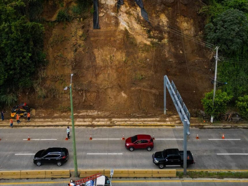 Actualmente, se ejecutan labores para la eliminación de un talud en el kilómetro 6 de la autopista a Comalapa. En estos momentos se trabaja en el perfilado del talud, y posteriormente se realizará el lanzado de concreto.