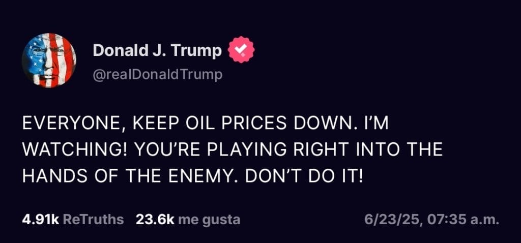“TODOS, MANTENGAN BAJOS LOS PRECIOS DEL PETRÓLEO. ¡LOS ESTOY VIGILANDO! ESTÁN JUGANDO A FAVOR DEL ENEMIGO. ¡NO LO HAGAN!”, escribió Trump, haciendo un llamado directo a productores e inversores para evitar un encarecimiento del crudo que, según él, beneficiaría a los adversarios geopolíticos de Estados Unidos.